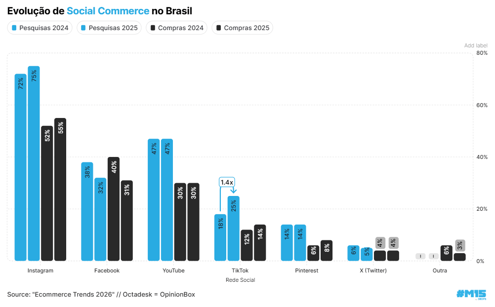 🔷 Pesquisa de produtos em redes sociais caiu de 66% para 58%.