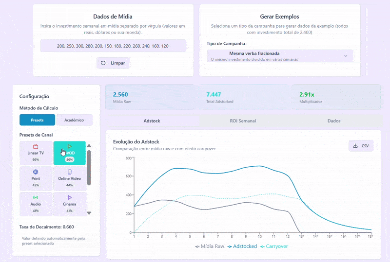 E claro que fizemos uma calculadora de Adstock e ROI prolongado para você simular os resultados de curto e longo prazo dos seus investimentos em mídia.