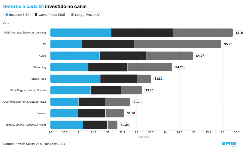 Por outro lado, quando pensamos em resultados consistentes no médio e longo prazo, canais como Mídia Impressa, TV, streaming e atvoltam a se destacar. É o dilema clássico do marketing: quem tem fôlego e pode esperar mais tempo para colher os frutos, tende a capturar retornos maiores.