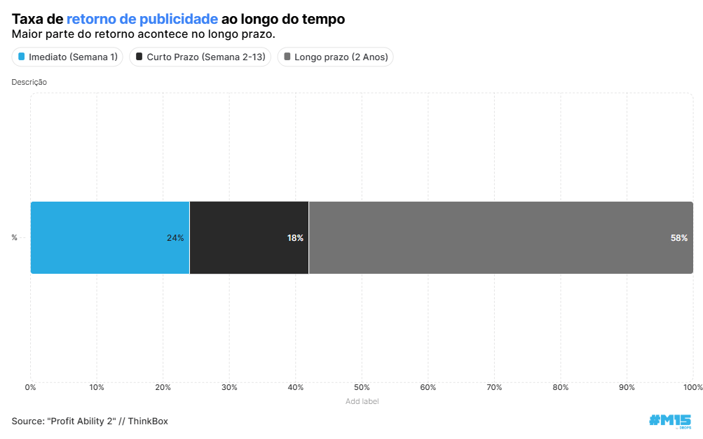 Uma parte considerável do resultado acontece na primeira semana (24%), em três meses você já colheu quase metade (42%), e a maior parte do impacto vem em até 02 anos. Claro que essa é uma generalização: para cada vertical, canal e região, os dados variam. Mas essa “rule of thumb” já é bem útil.