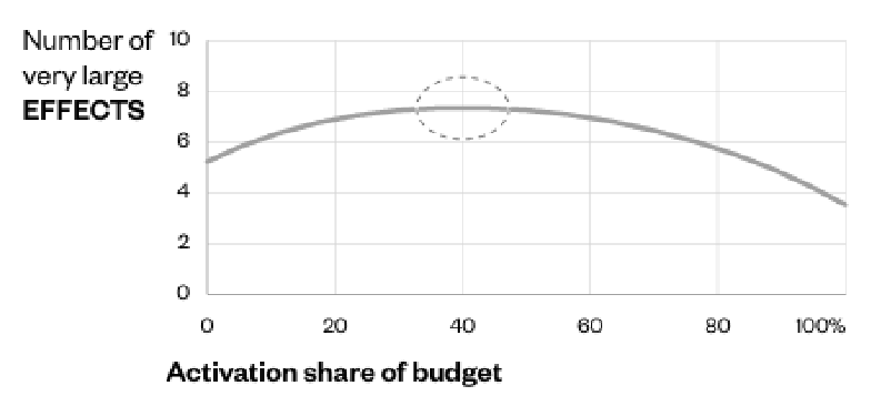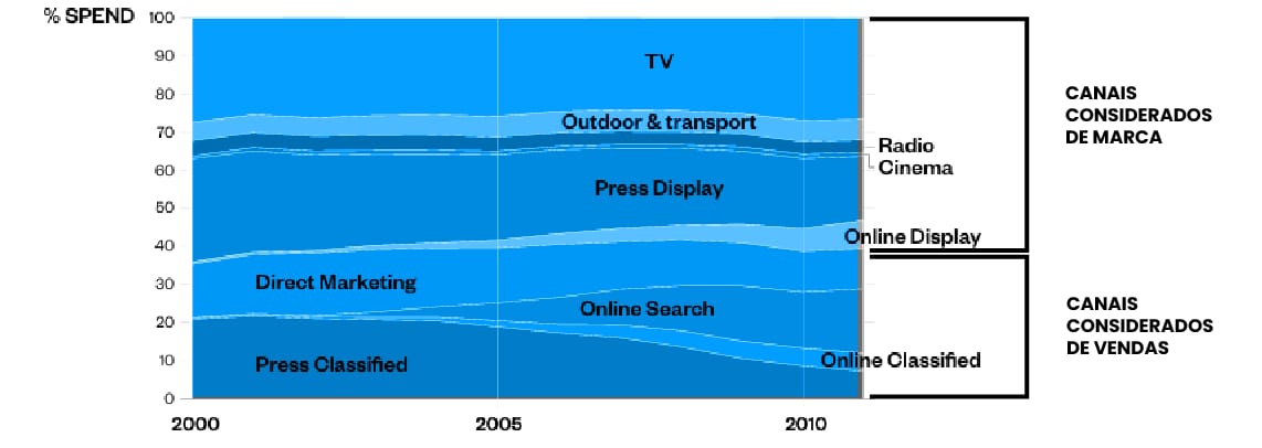 Essa proporção ganhou fama com o livreto The Long and the Short of It (2014) ¹, de Les Binet e Peter Field. Eles mostraram que as marcas mais bem-sucedidas no Reino Unido seguiam, em média, esse equilíbrio: 60% dos investimentos em canais mais focados em construção de marca (omo TV, rádio, OOH) e 40% em canais mais focados em ativação de vendas (como search e promoções).