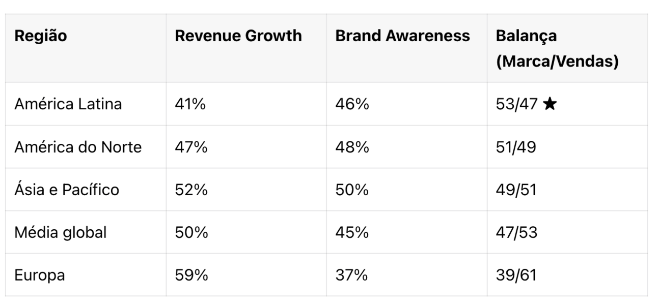 🔷 O branding voltou: a América Latina é a região onde “reconhecimento de marca” apareceu como prioridade maior do que “crescimento de receita”.