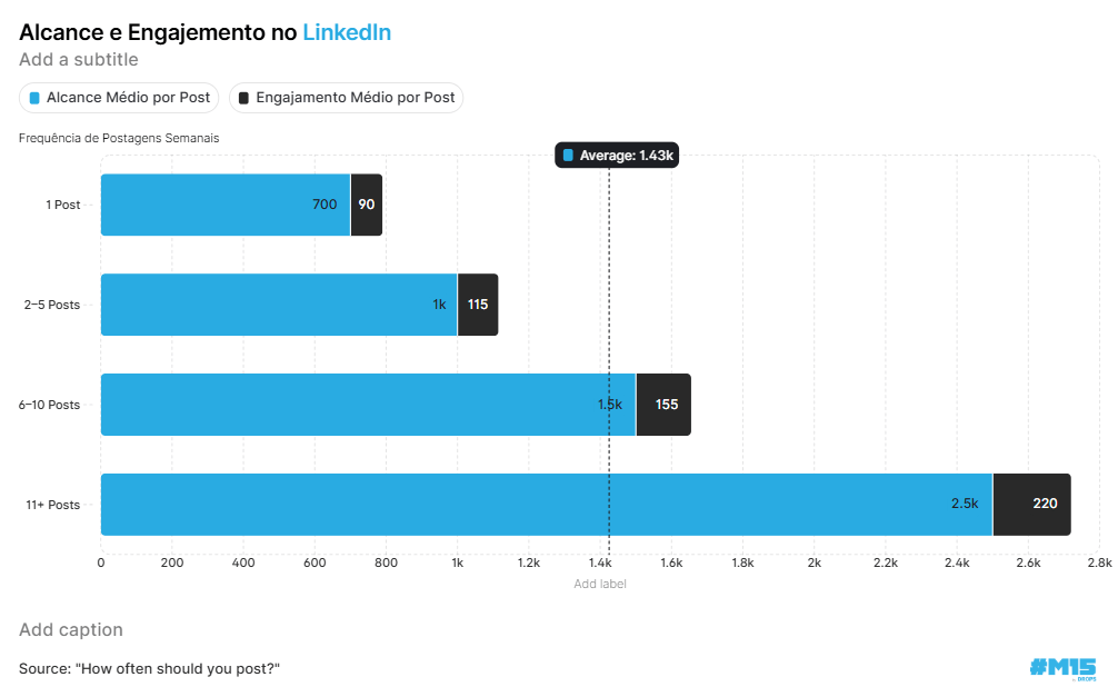 Um novo estudo¹ fez uma análise global de 94.000 posts pessoais no LinkedIn para medir como o alcance e engajamento se comportam de acordo com o volume de postagens. A conclusão: a rede está tão frenética quanto todas as outras. Se você tem em média 1.400 de alcance e 10% de engajamento, você está na média. Se não, aumentar a frequência de postagens pode te ajudar.