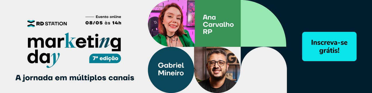 Com o tema “Estratégias em múltiplos canais", a RD convocou nomes como Gabriel Costa (GLA), Dafne Souza (Meta) e vários outros para mostrar a jornada da atração à conversão, além de discussões afiadas sobre como usar — de verdade — canais como WhatsApp, redes sociais, mídia paga, e-mail e o que mais estiver no playbook. O evento é online, gratuito, bem no Dia do Profissional de Marketing (08/05), às 14h.