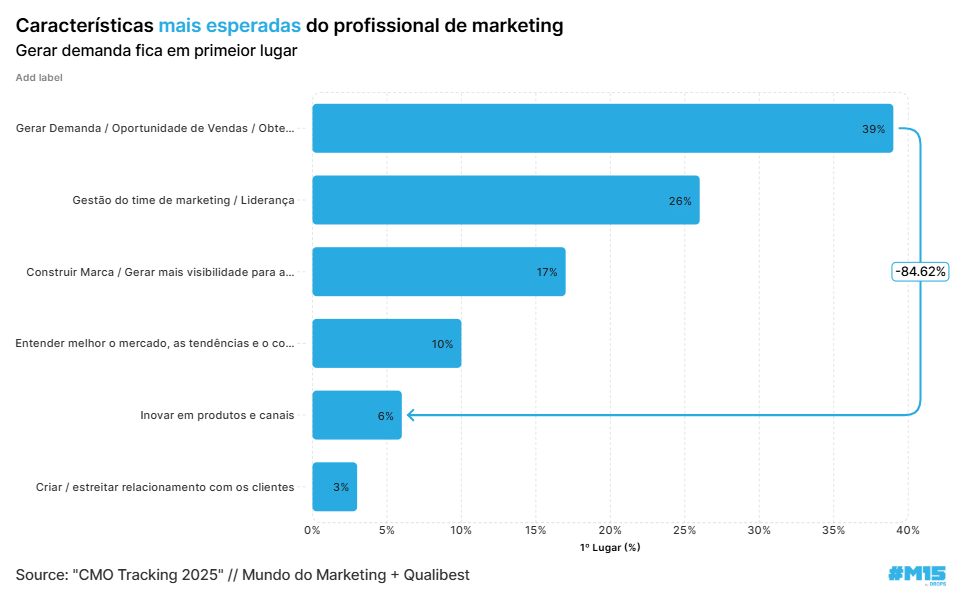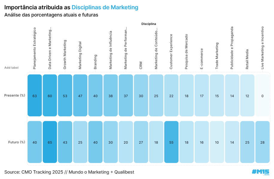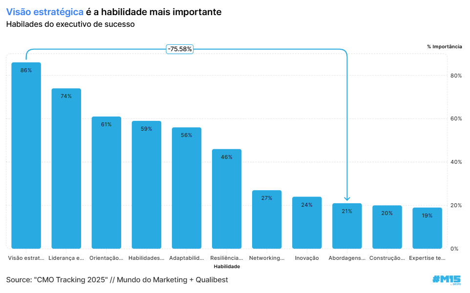 Esta semana o Bruno Mello do Mundo do Marketing, me mandou a pesquisa “CMO tracking 2025” que eles fizeram. Acho que ela ainda não foi divulgada oficialmente, mas um ponto me chamou muito a atenção: quais habilidades os líderes de marketing no Brasil consideram essenciais hoje – e quais serão as mais valorizadas no futuro.