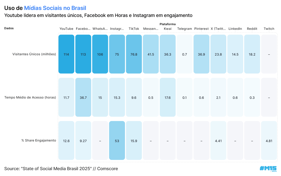 🔷 No tempo médio de uso, o Facebook dá um banho: 36,7h, contra 15,3h do Instagram.