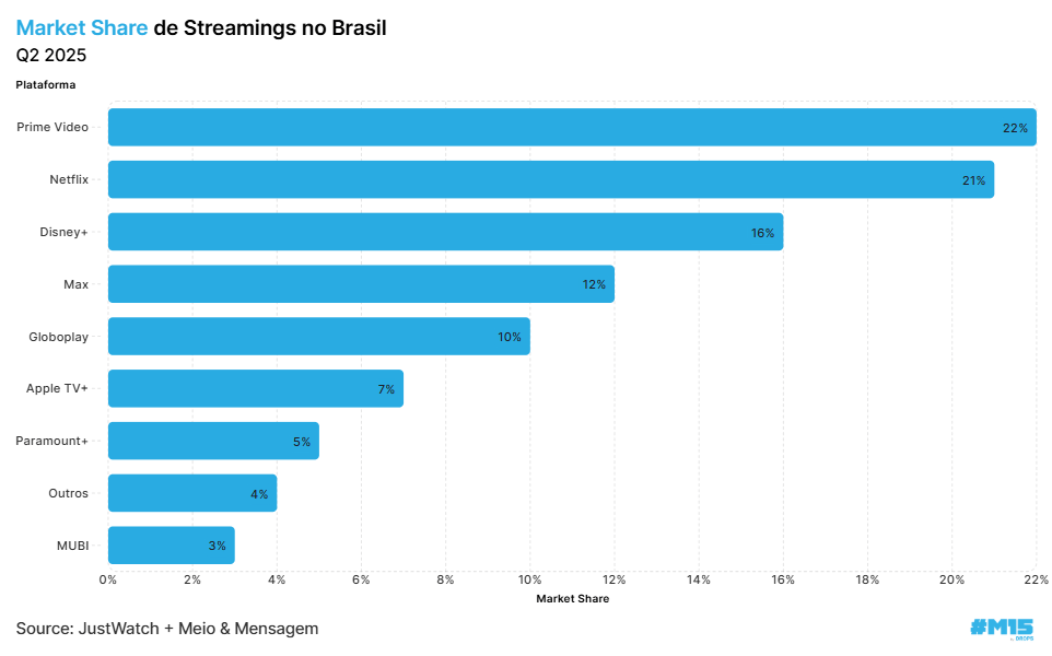 🔷 Prime Video superou a Netflix em market share no Brasil: 22% vs 21%¹