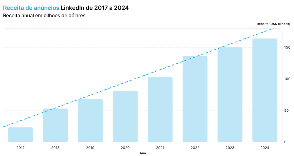 A receita anual apresenta um aumento consistente de 23 bilhões de dólares em 2017 para 164 bilhões em 2024.