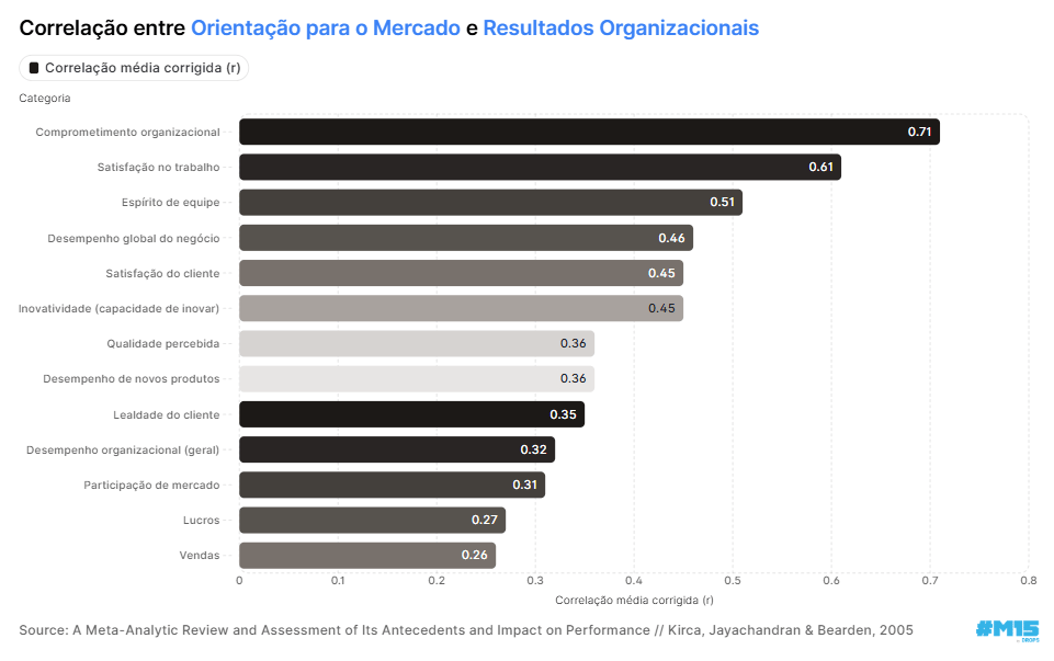 O ponto é que o hábito de realizar pesquisas de mercado não apenas gera dados, mas fortalece uma capacidade organizacional mais ampla: a de se tornar verdadeiramente orientada ao mercado. Empresas que adotam rotinas sistemáticas de coleta, disseminação e resposta às informações sobre clientes e concorrentes desenvolvem uma inteligência coletiva capaz de antecipar mudanças e adaptar-se mais rapidamente. E isso se traduz em resultado: segundo a meta-análise de Kirca, Jayachandran & Bearden (2005), que analisou 14 mil empresas, organizações com maior orientação para o mercado apresentam desempenho significativamente superior. Veja os efeitos no gráfico abaixo: