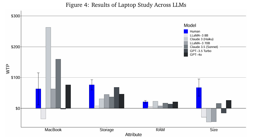 Mas uma pesquisa publicada este mês foi mais a fundo. Os pesquisadores se perguntaram: Será que podemos simular pesquisas inteiras como escolha de atributos, e disponibilidade de pagar no marketing? Os resultados foram promissores, modelos mais avançados, como o GPT-4o chegaram perto de chegar nos dados reais da pesquisa. Israeli e Ngwe (2025)