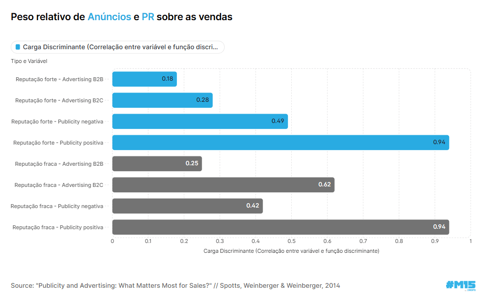 Já no caso de marcas pouco conhecidas, o cenário se inverte parcialmente. As notícias negativas perdem o efeito benéfico, e as campanhas de mídia paga ganham relevância. Ainda assim, o impacto da construção de reputação permanece cerca de 30% superior ao da publicidade pura.