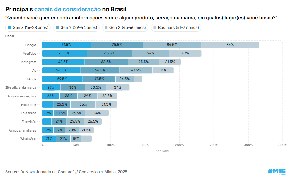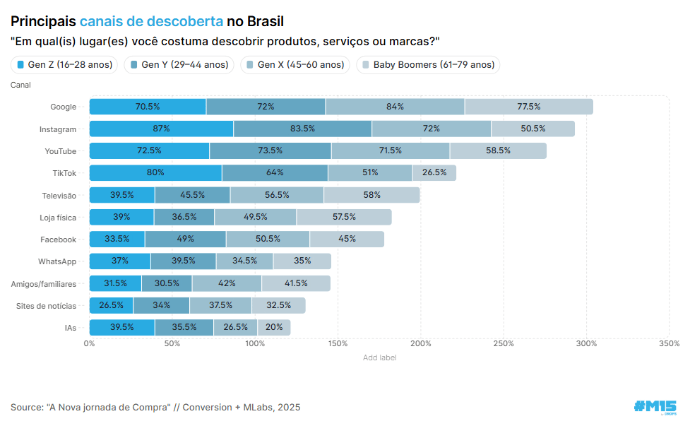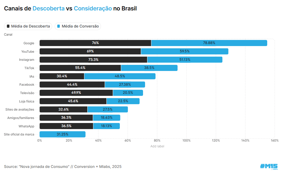 Um ponto que me chamou atenção: o YouTube aparece como o segundo canal com maior relevância combinada entre descoberta e consideração, atrás apenas do Google e, mesmo assim, vejo poucas marcas realmente investindo neste canal.